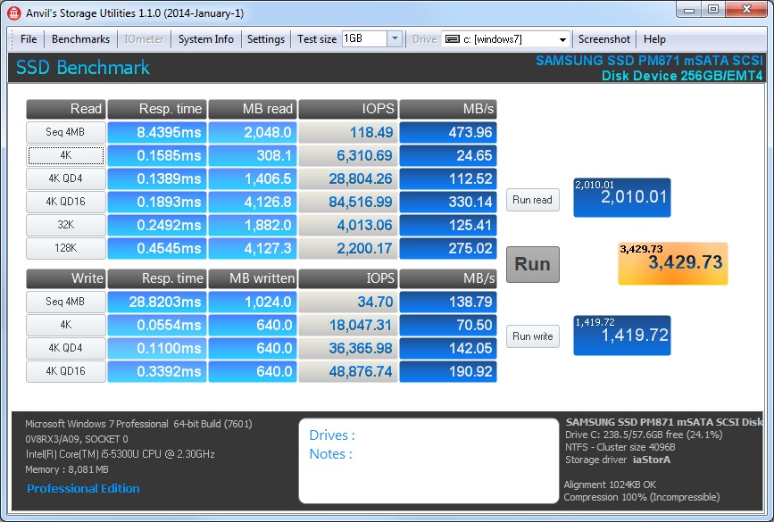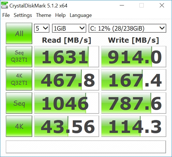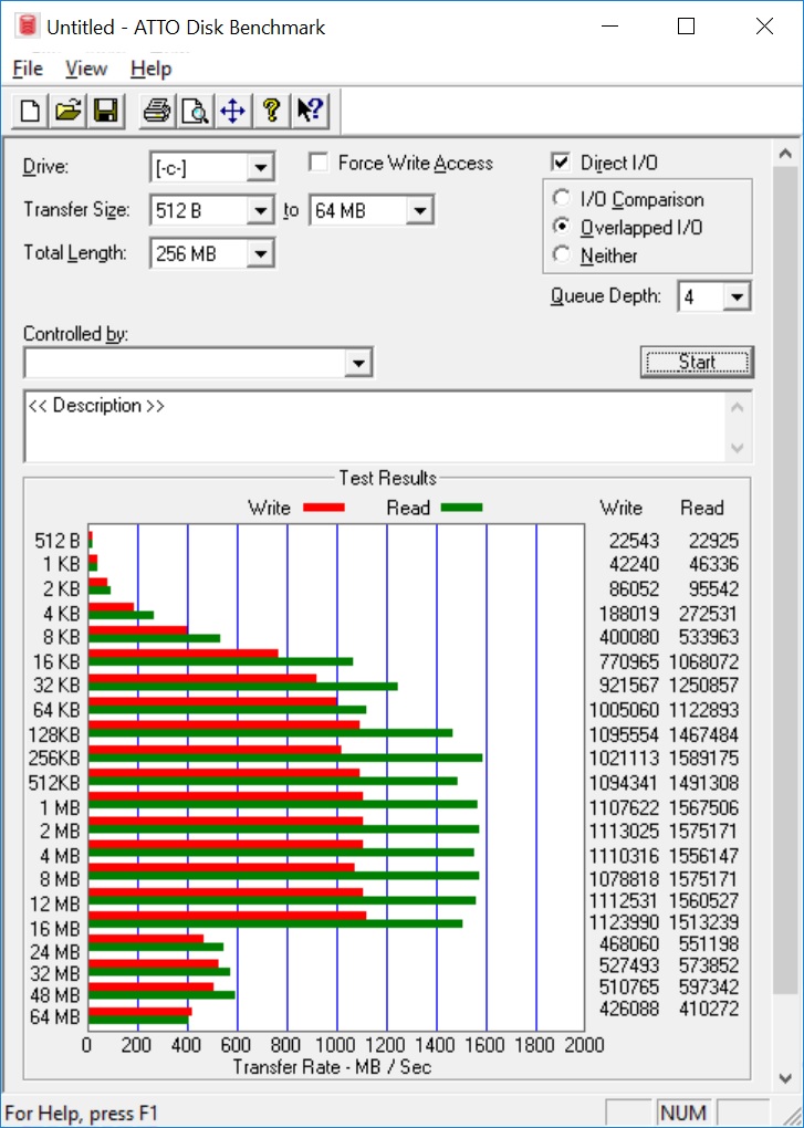 | Max Read Speed: 1,589Mb/sec Max Write Speed: 1,123 Mb/sec |