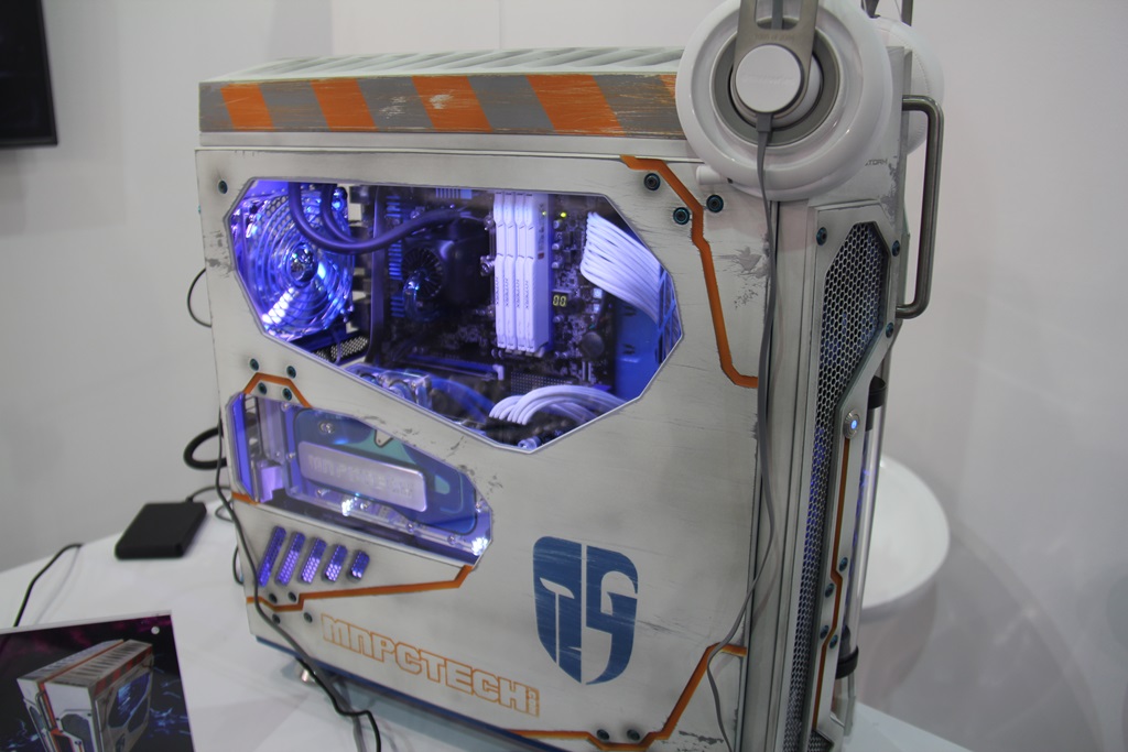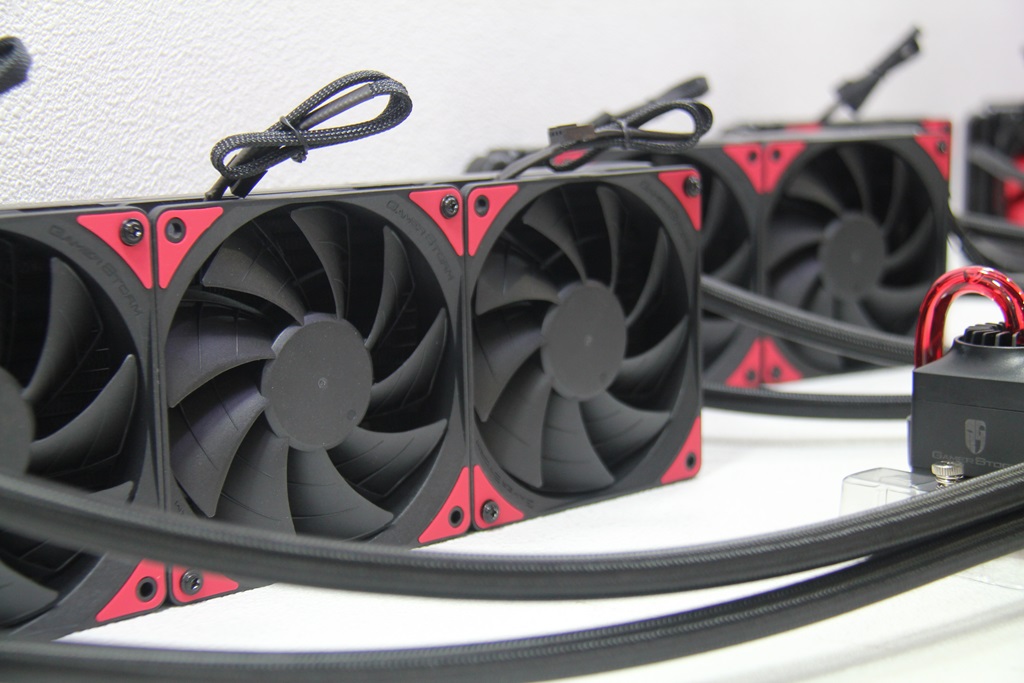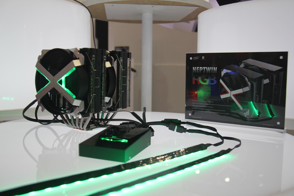 在展位上展出的是Deelcool的基因组底盘,并安装了其多合一液体冷却(AIO)单元。他们还拥有一个完全RGB的LED带,以及带有改装风扇的不错的CPU冷却器。