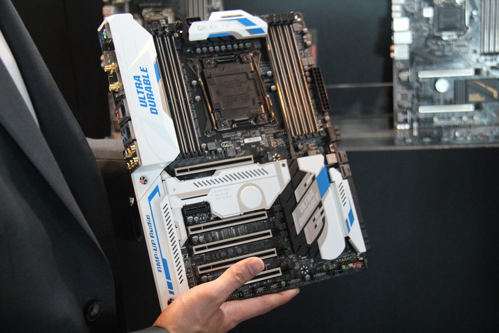 他们的旗舰主板GA X99 Designare EX(具有超耐用性)展示了,并带有一个新的外观,在PCIe和内存插槽上有额外的保护,以及芯片组和后面板周围好看的保护板。