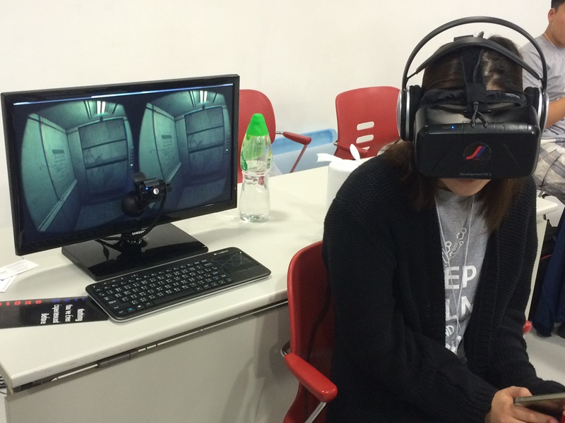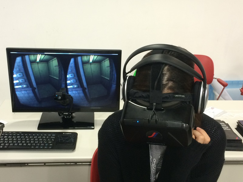 有趣的是,有一个小展台在展示Oculus Rift。这是他们用来开发篮球游戏的开发工具,还不错。