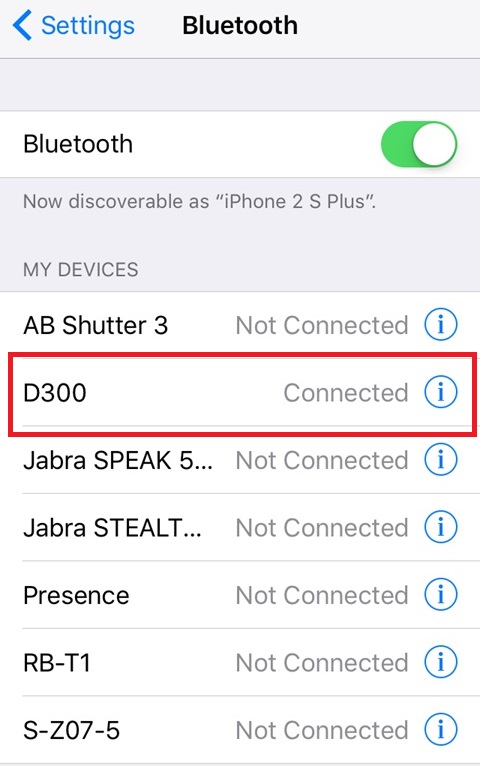 配对和连接D300很简单和容易。按住中心按钮(按钮)曼氏金融到蓝色和红色指标或者闪烁。D300应该出现在你的智能手机的蓝牙菜单。在我们的例子中,我们使用iPhone。